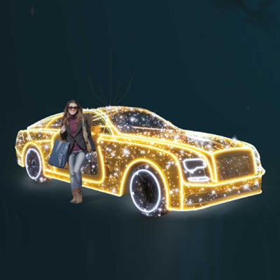 Rev up your business or city center display with this Giant Pre-Lit LED Sports Car! Perfect for Christmas, holidays, or any occasion, this oversized LED vintage car creates a festive atmosphere both indoors and outdoors. Perfect for commercial or municipality displays. Constructed with durable metal framing and outdoor-rated LED mini lighting, it provides a dazzling and memorable experience. Capture the spirit of the holidays with our one-of-a-kind photo backdrop - the Giant Pre-Lit LED Sports Car!