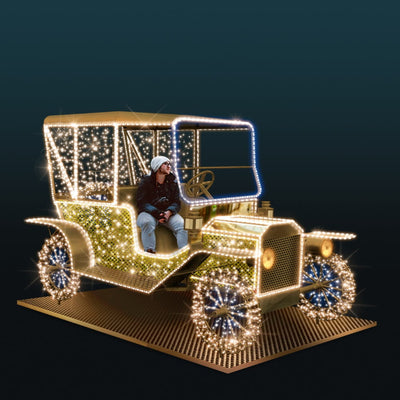 Get rolling with this Giant Pre-Lit LED Vintage Car! What an awesome addition for your commercial or city center display. Versatile for Christmas, Holidays or any occasion this giant LED Vintage Car will jazz up any atmosphere. Festive and fun, this display will create the perfect backdrop indoors or outdoors. Built on durable metal framing with outdoor rated LED mini lighting to provide an illuminating glow.