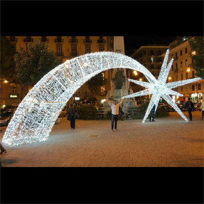 This elegant Giant Pre-Lit LED Walk-Through Shooting Star Arch will take your commercial property or city center design out of this world! This large indoor or outdoor Walk-Through Star Arch sets the scene for any Holiday or Christmas display. Built on durable metal framing with outdoor rated white LED mini lights to provide a brilliant glow.